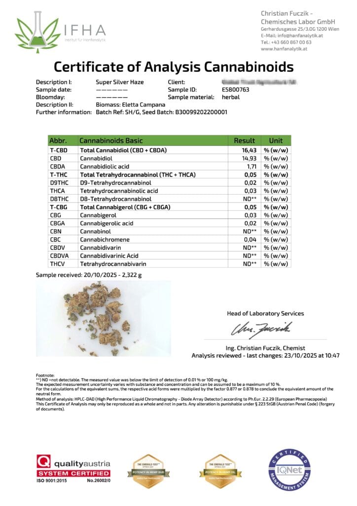 Super Silver Haze är en välkänd CBD-blomma som odlas inomhus med stor omsorg. Blommorna är ljusgröna och kompakta med gott om trikomer och tydliga pistiller. Doften är tydligt citrusdominerad – frisk och tung på samma gång – med örtiga och lätt söta inslag. Sorten kommer från samma odlare som står bakom Mango, Blueberry Muffin och Orangello, en producent som vunnit priser på mässor och tävlingar runt om i Europa.