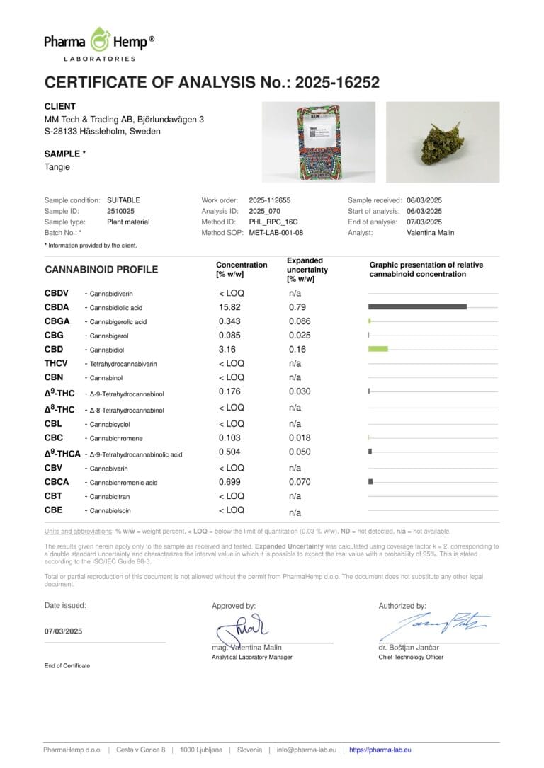Tangie odlas med omsorg under Sardiniens soliga klimat, där de får utvecklas naturligt till högsta kvalitet. Våra erfarna odlare, som även ligger bakom favoriter som California Dream, Strawberry och Harley Quinn, står för den expertis och noggrannhet som gör Tangie unik.